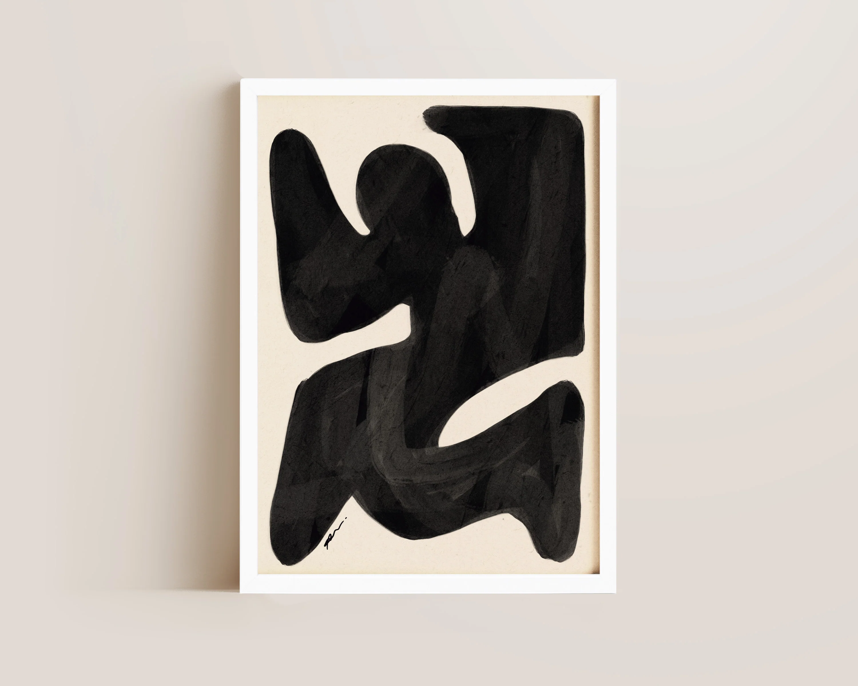 An abstract print featuring a black silhouetted figure, against a beige background. The perfect statement piece for a living room. Printed on archival matte 240gsm paper. Available in multiple sizes, with framed or unframed options. Exclusively designed by one of our artists at our studio.