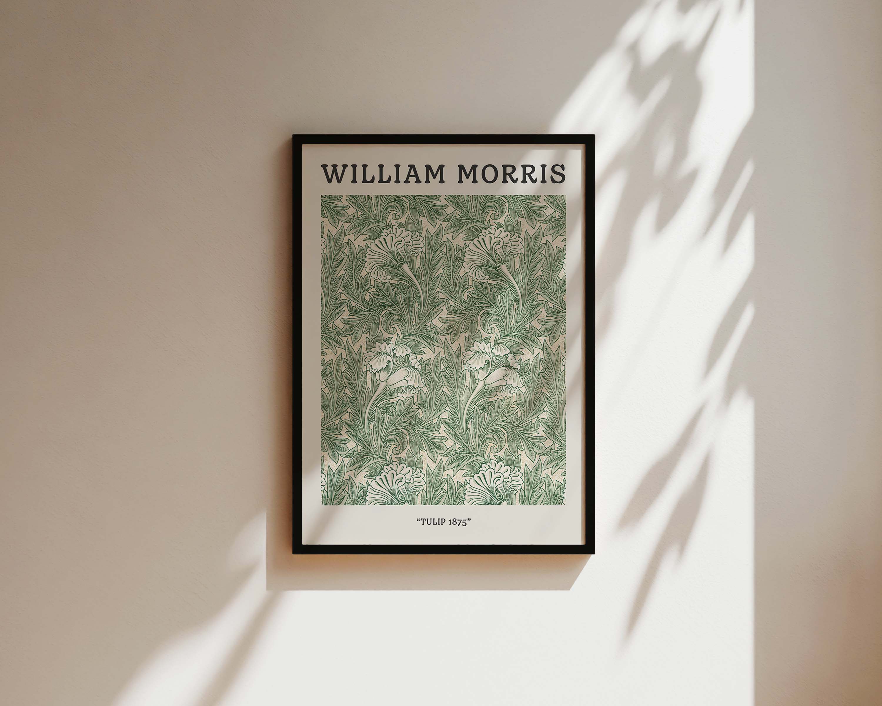A classic William Morris Tulip 1875 pattern print, featured in a vintage exhibition design. Exclusively designed by one of our artists at our studio.Â