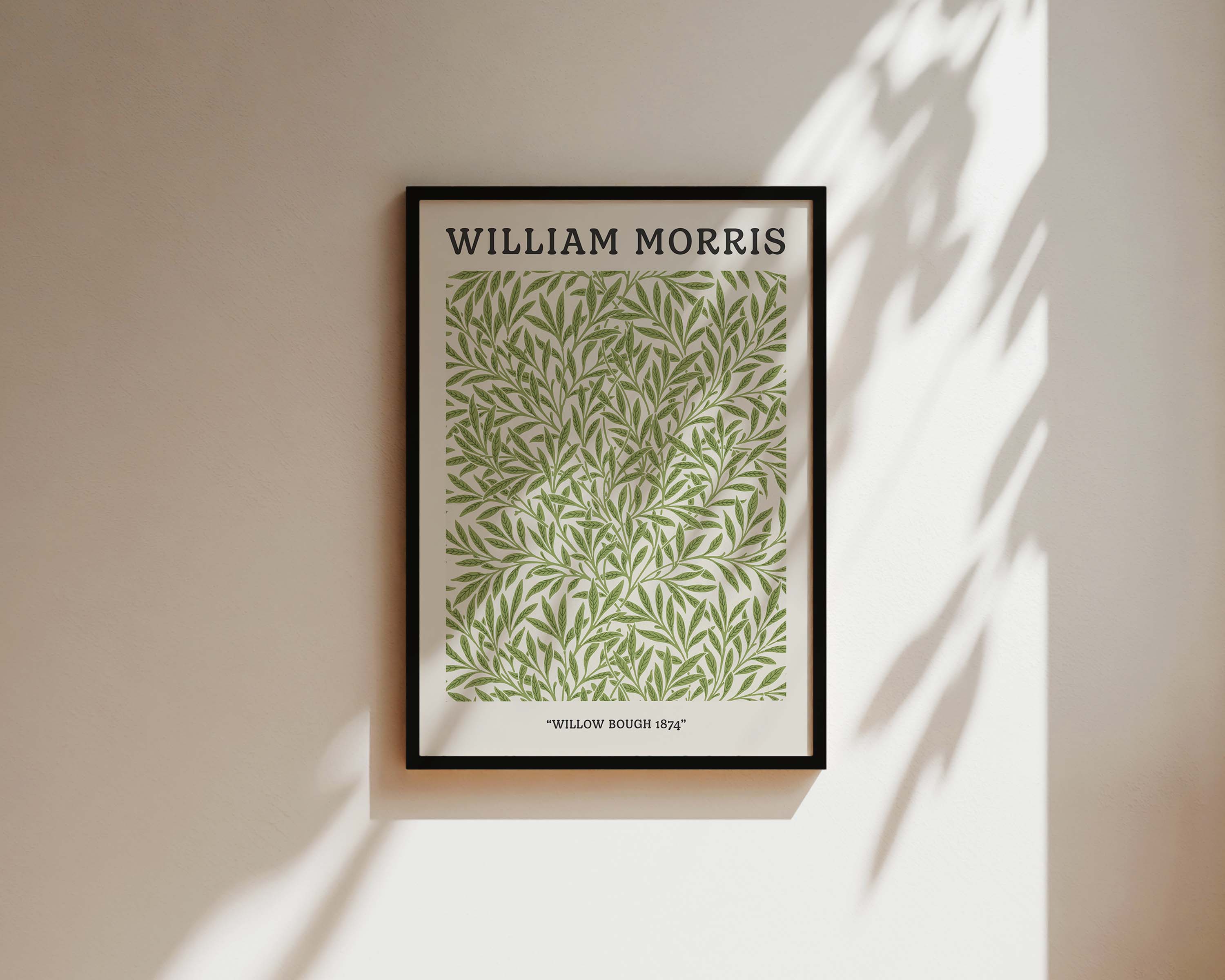 A classic William Morris Willow Bough 1874 pattern print, featured in a vintage exhibition design. Exclusively designed by one of our artists at our studio.Â
